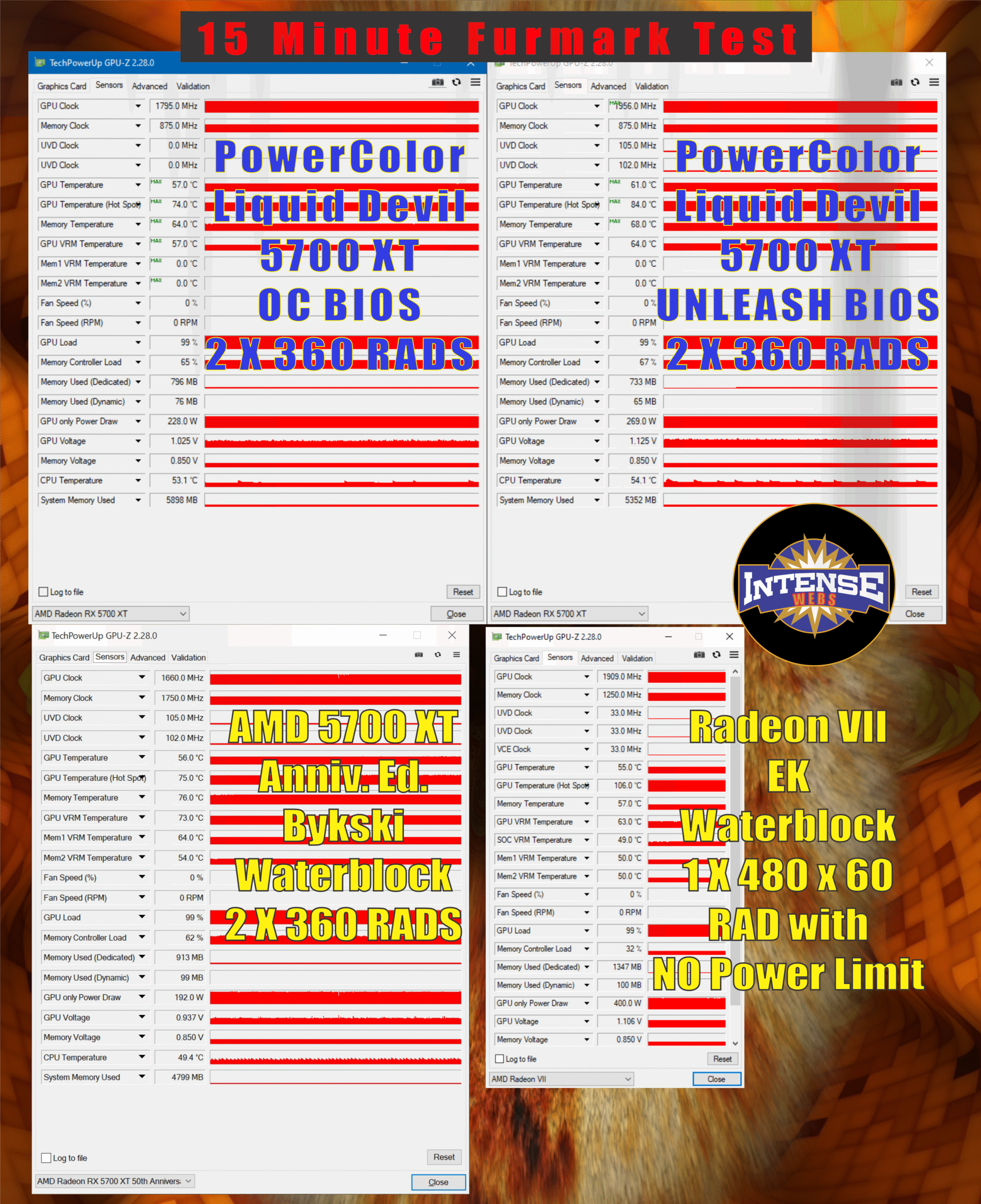UPDATE: I added a RADEON VII with EK Waterblock to the Comparison. A Discord User and myself tested our Radeon RX 5700 XT’s today. We both ran a 15 minute Furmark test. PowerColor Liquid Devil 5700 XT vs AMD 5700 XT Anniv. Ed. with Bykski Water Block. Both had 2 X 360 Radiators and both ended up with inline water at 36C. He used Liquid Devil’s UNLEASHED BIOS stock and I used AMD Anniv. Factory OC BIOS stock. He saved time not having to put on WB and I saved $50 and lost an hour. We called it a draw. Above are the results. ALL TESTS WERE RAN ON DEC. 21, 2019.